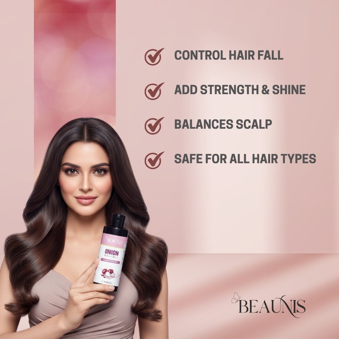 Experience advanced hair fall control and nourishment with Beaunis Onion Hair Oil, expertly formulated for all hair types. This luxurious hair oil blends powerful ingredients to help you achieve thicker, healthier, and shinier hair.